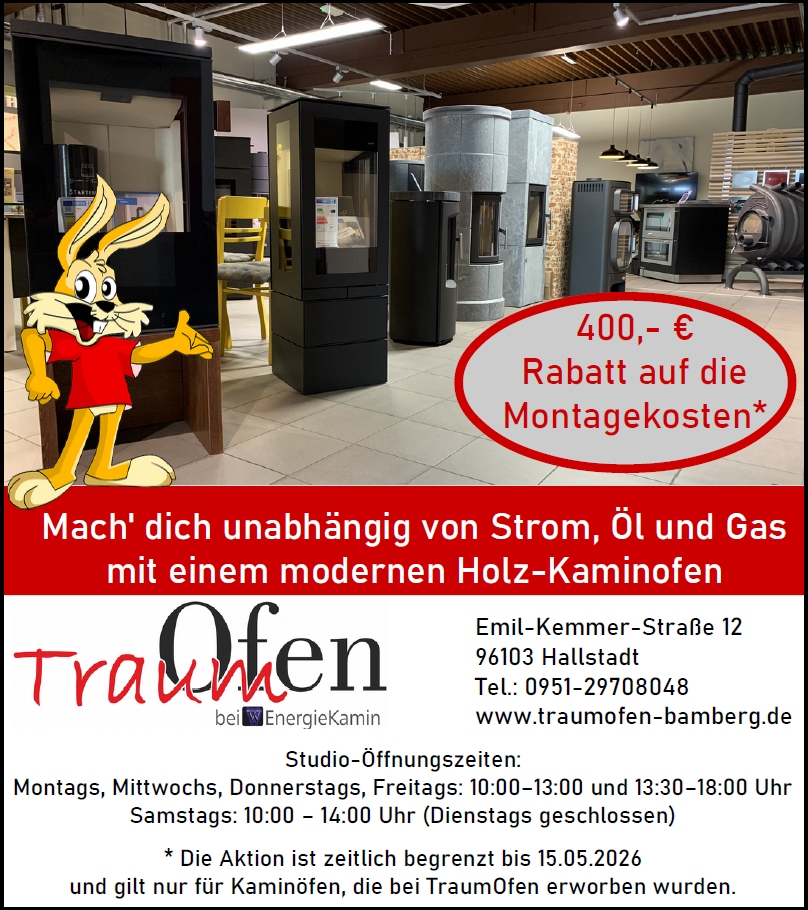 Zu Ostern erhalten Sie obendrein 400,- Euro Rabatt auf die Montagekosten, wenn Sie sich bis spätestens 15.05.2026 für einen Kaminofen aus Ihrem TraumOfen-Studio entscheiden.